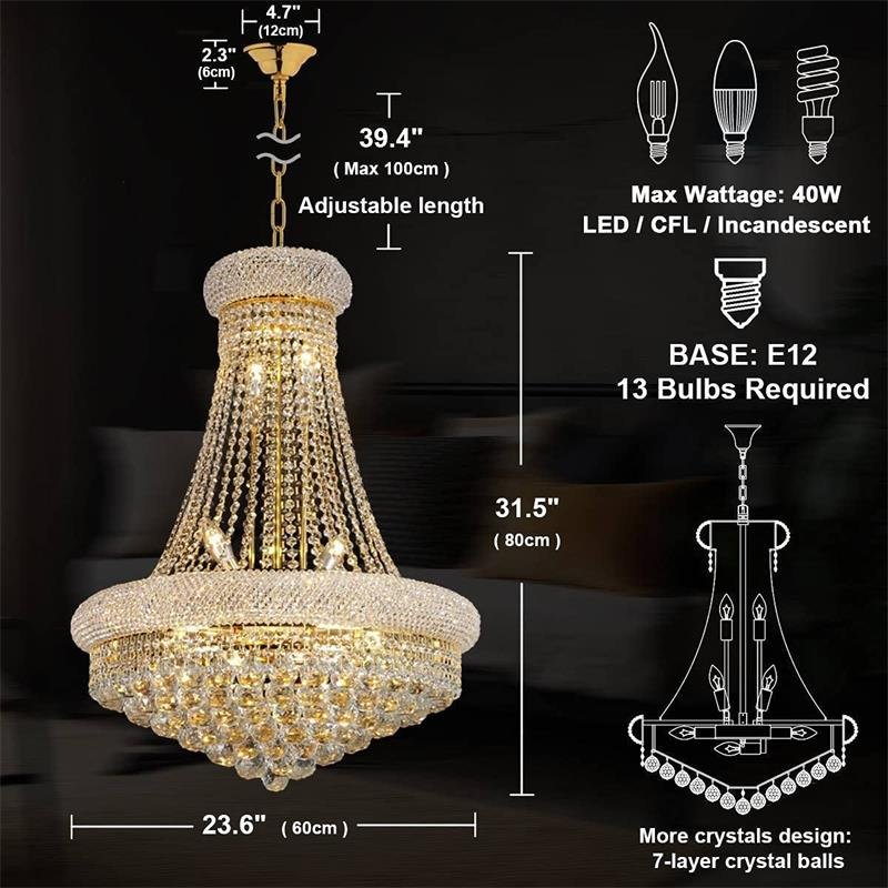 | Product name | J&S 13-Lights Golden Finish Classic Empire Style K9 Crystal Chandelier Ceiling Light for Living Room Foyer Dining Room Hallway Bedroom (24×31.5 inch) New Packaging Easy to Install… |