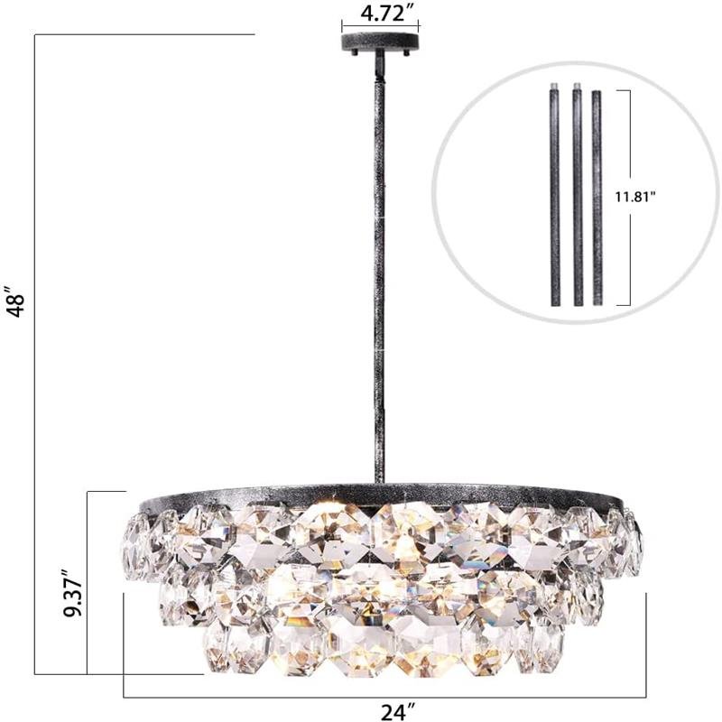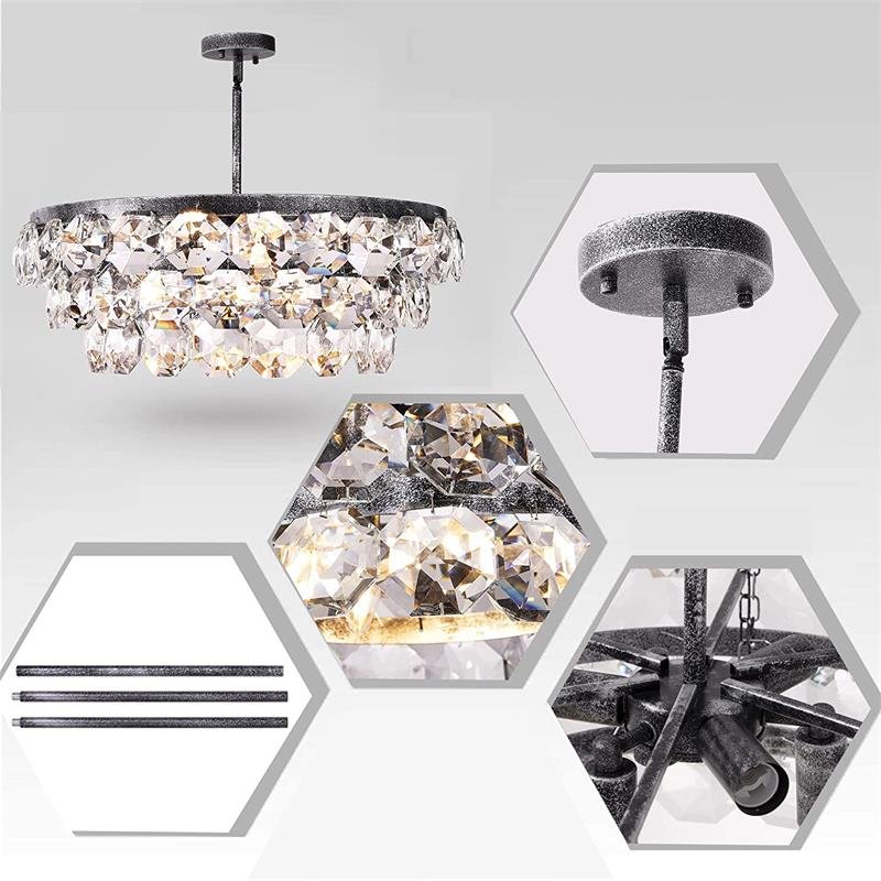 This 6-light crystal chandelier features round metal frame in antique silver finish, and the geometric shape of the sculptural crystals makes this lighting an updated take on a traditional design. The crystal light gives off great light and the style is a great mix of industrial/modern and rustic.