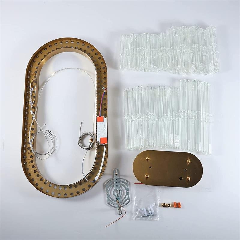 This oval crystal chandelier is designed with a brass brushed stainless steel frame fixed built in LED.